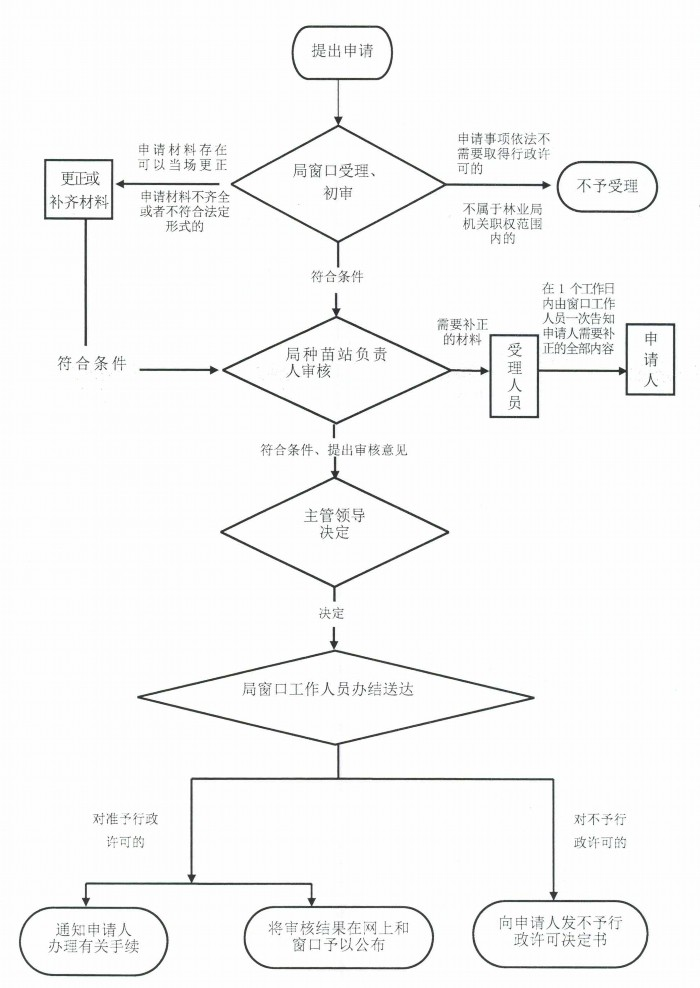 | 一、受理 (一)岗位责任人:政务中心工作人员 (二)岗位职责及权限:按照标准查验申办材料。符合受理标准的,及时受理,并进行受理登记,不符合受理标准的,不予受理,退回材料,告知理由。 (三)时限:即时 二、初审 (一)岗位责任人:局主管领导 (二)岗位职责及权限; 1、由种苗站工作人员审查申报材料是否真实。 A、申请人申报的材料不真实、不合法由工作人员书面告知理由,退回材料; B、申请人提交的材料合法真实需要补正材料的,由窗口工作人员一次告知申请人需补正的全部内容; C、许可事项直接关系他人重大利益的,应当告知该利害关系人; 2、对符合条件的,交种苗站负责人进一步审查。认为可行的,科室负责人作出审查意见交主管领导决定。 3、主管领导负责审查材料是否属实,然后作出决定签署意见。 A、发现审查意见与事实不相符,许可事项不符合许可条件、标准的,不予上报,将其申请材料全部退回窗口,并以书面形式说明理由。 B、许可事项符合许可条件、标准的,签署同意的意见。 (三)时限:20个工作日 三、按要求将文字材料归档 时限:即时 |